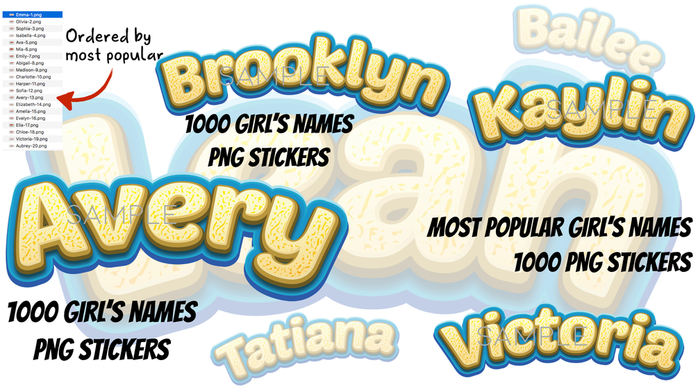 For a full list of all names, scroll to the bottom. Each name is it's own 300 dpi png sticker.